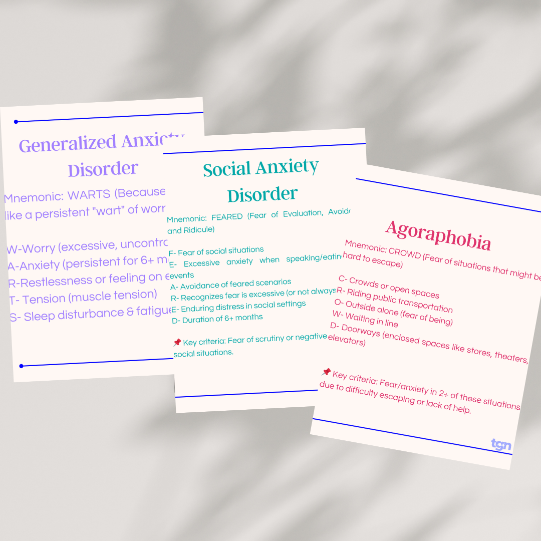 Struggling to remember the criteria for anxiety disorders? Our Anxiety Disorder Mnemonics Flashcards simplify DSM-5-TR learning with easy-to-remember acronyms and engaging visuals! Whether you're studying for the NCMHCE, LPC, LCSW, or psychology exams, these flashcards will help you recall key diagnostic criteria quickly and effectively.