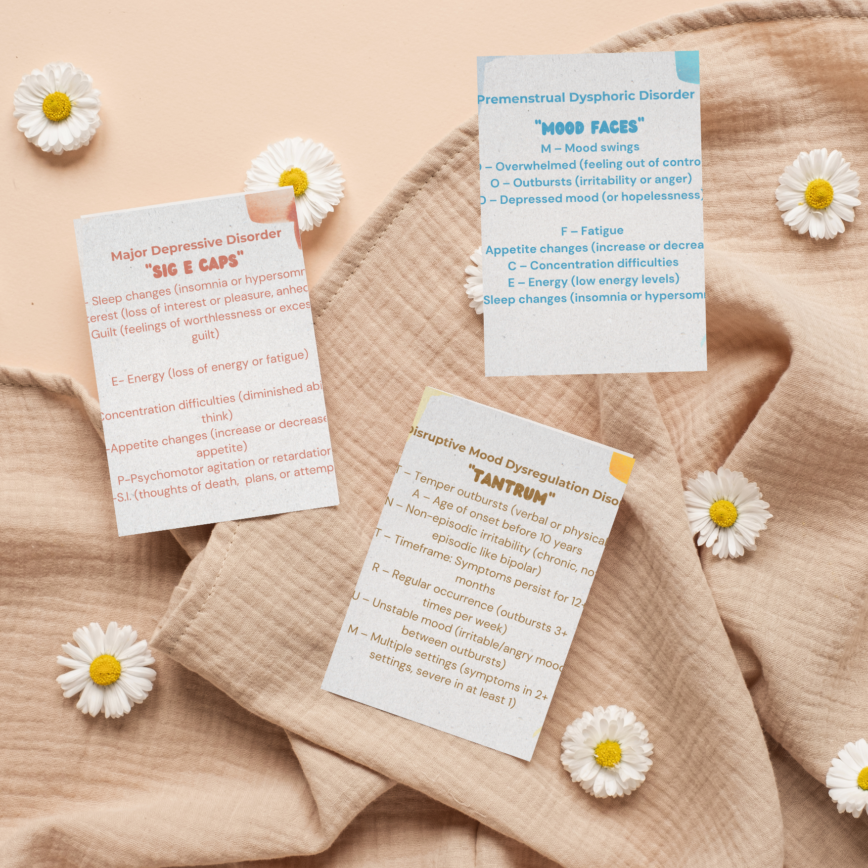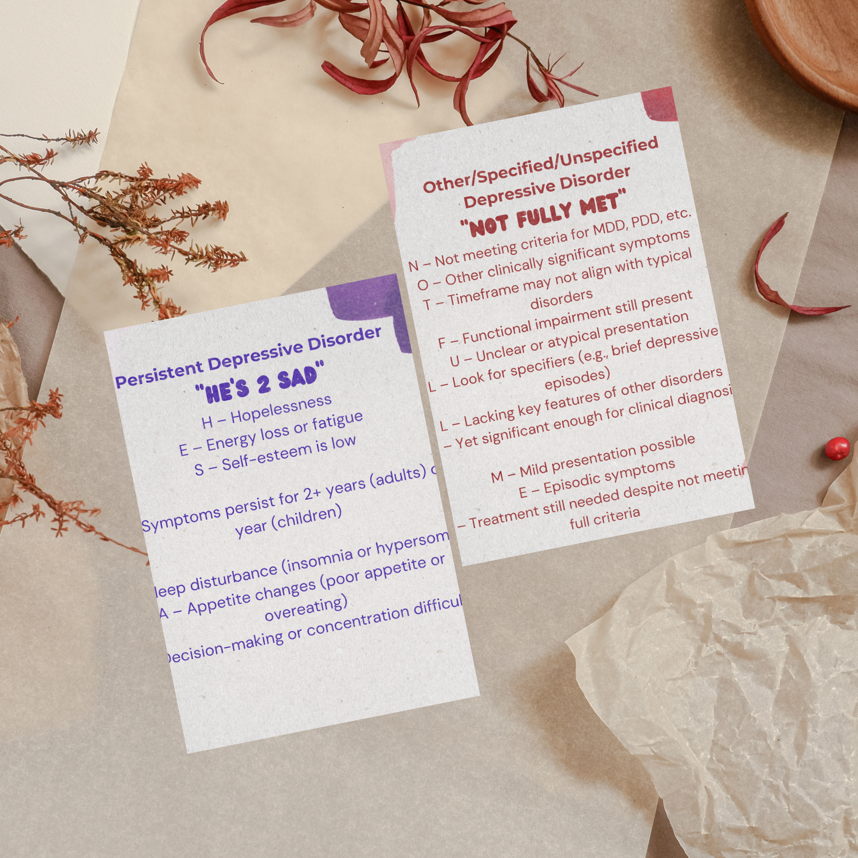 Struggling to remember the diagnostic criteria for depressive disorders? Our Depressive Disorders Mnemonics Flashcards make studying effortless with easy-to-remember acronyms, clever word associations, and key DSM-5-TR criteria—all in a compact, portable format.