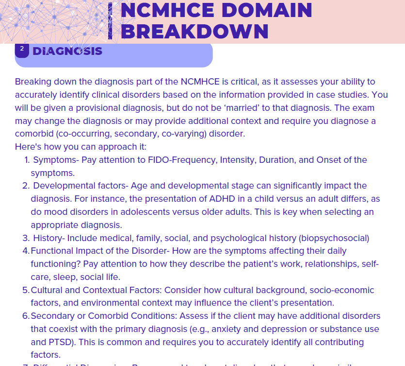 Prepare confidently for the National Clinical Mental Health Counselors Exam with our study guide, organized to align with the exam's domains. Enhance your understanding and potential success with our valuable narrative tips.