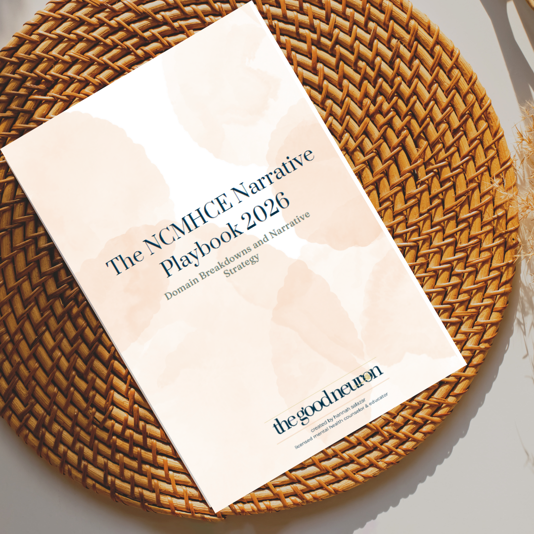 Educational resource only. This guide does not replace NBCC materials, clinical supervision, or professional training. Contact Hannah Salazar, LMHC at info@thegoodneuron.com if you have any questions.