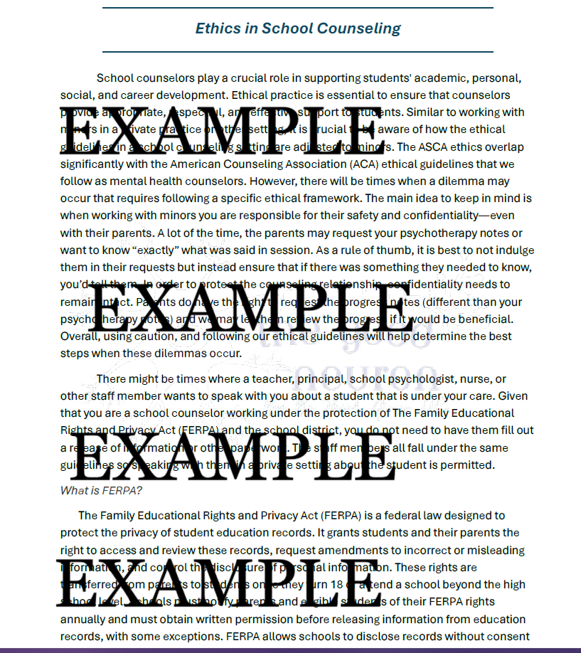Explore school counseling roles and responsibilities, ethical considerations, and the difference between 504 plans and individualized education plans. Feel confident and prepared for any question, with 10 pages of curated information specifically for the National Clinical Mental Health Counselors Exam (NCMHCE).